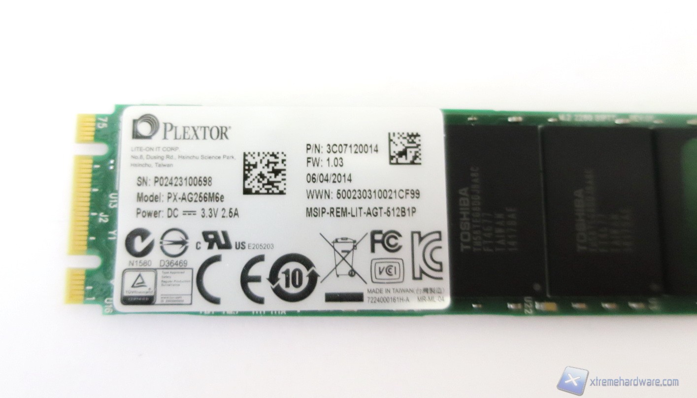 Il Plextor M6e utilizza un fattore di forma M.2 2280 e ha un PCB dalle dimensioni ridottissime che presenta, da una estremità, un pettine che andrà inserito nello slot M.2 e, dall'altra, un foro necessario al relativo blocco. Le dimensioni del singolo SSD sono pari a 22 x 80 x 3,85mm e come possiamo vedere permettono di alloggiare in maniera abbastanza agevole fino a quattro NAND flash per ciascuno dei due lati, oltre al controller ed il chip adibito alla cache.