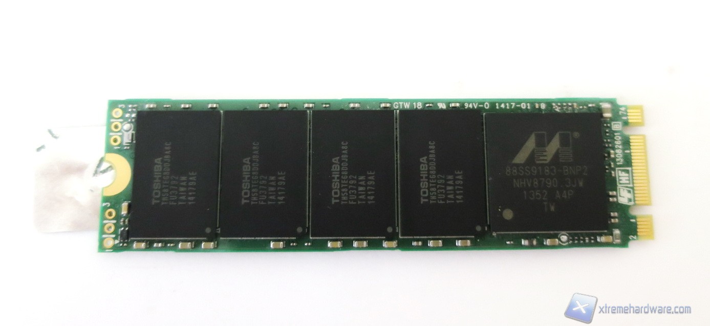 Passando ad analizzare la NAND troviamo otto chip di memoria con sigla TH58TEG8DDJBA8C, i quali sono prodotti sempre da Toshiba con processo litografico a 19nm e con una densità di 256Gbit (32GB). Tali NAND Flash utilizzano una configurazione MLC (Multi Level Cell), con package del tipo 132 BGA e sono conformi allo standard DDR Toggle Mode 2.0 con un lifetime stimato in circa 3.000 cicli di scrittura.